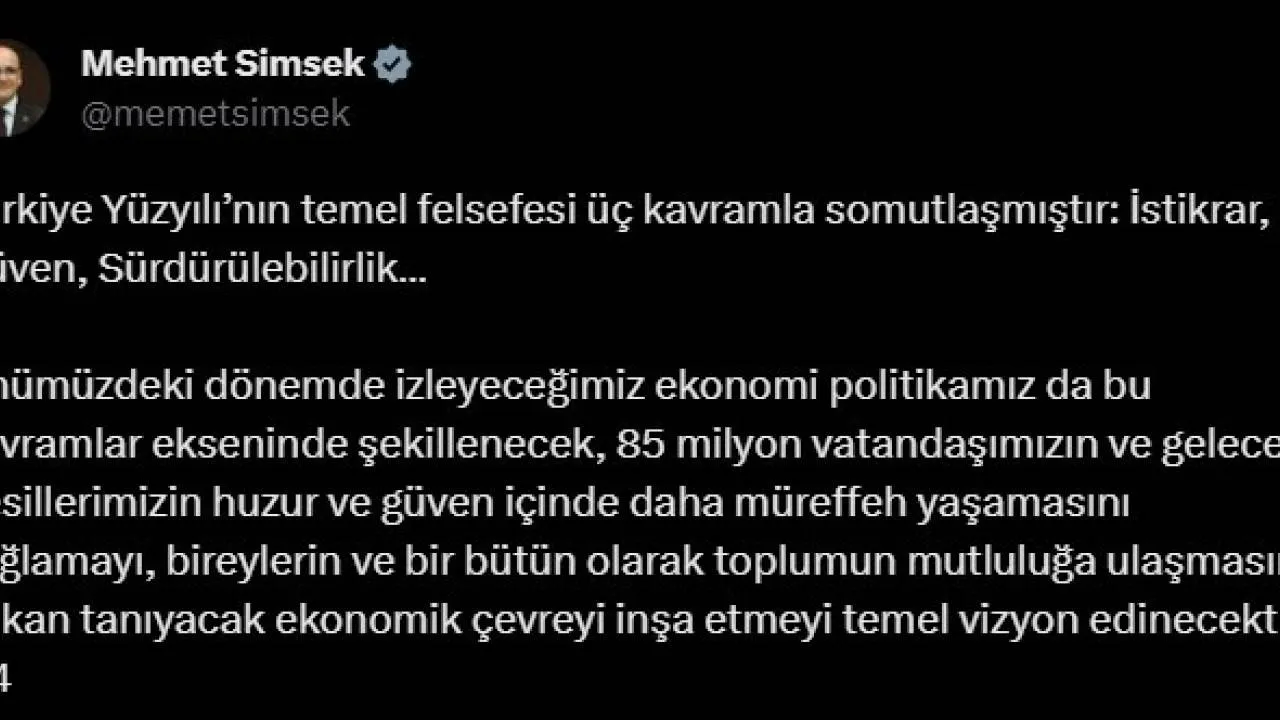 Şimşek açıklamasında, Türkiye Yüzyılı’nın temel felsefesinin istikrar, güven ve sürdürebilirlik kavramı ile somutlaştığını savunarak, “Önümüzdeki dönemde izleyeceğimiz ekonomi politikamız da bu kavramlar ekseninde şekillenecek, 85 milyon vatandaşımızın ve gelecek nesillerimizin huzur ve güven içinde daha müreffeh yaşamasını sağlamayı, bireylerin ve bir bütün olarak toplumun mutluluğa ulaşmasına imkan tanıyacak ekonomik çevreyi inşa etmeyi temel vizyon edinecektir” dedi.