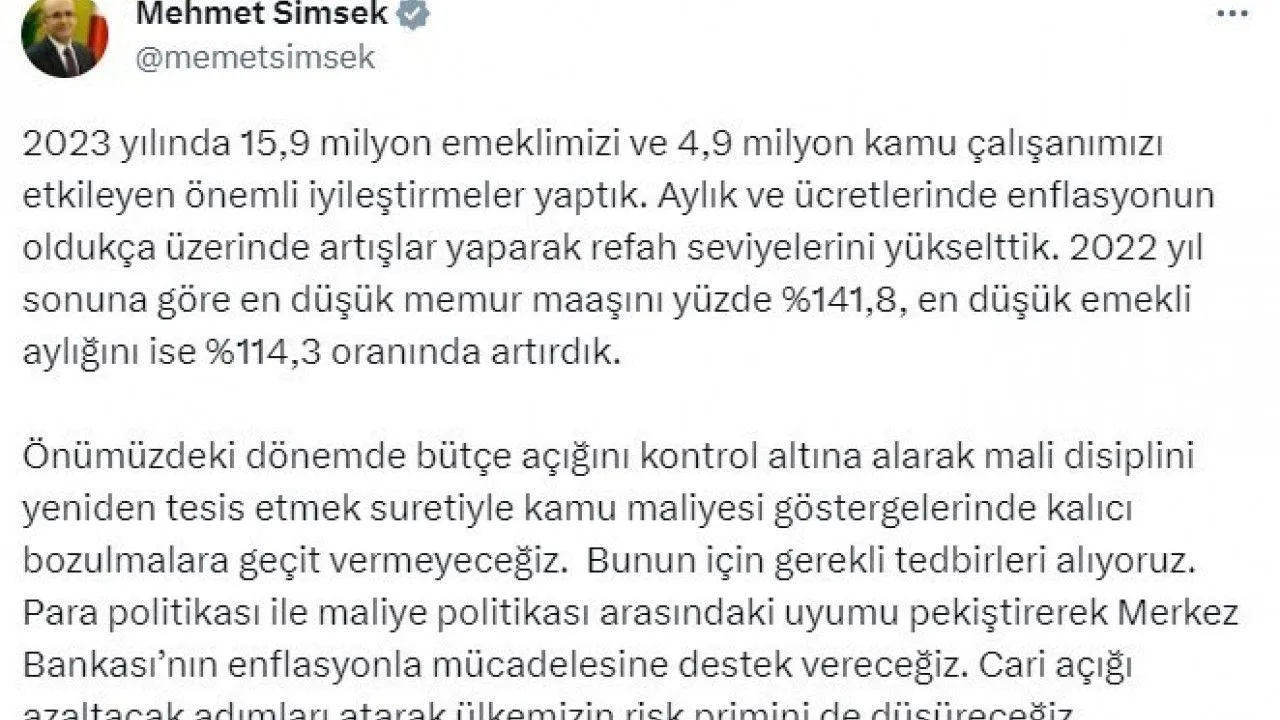 Hazine ve Maliye Bakanı Mehmet Şimşek, sosyal medya hesabından yaptığı açıklamada mali disiplinin yeniden tesis edilmesi için kamu maliyesi göstergelerinde kalıcı bozulmalara geçit verilmeyeceğini belirtti. Bakan Şimşek, paylaşımında şu ifadelere yer verdi: