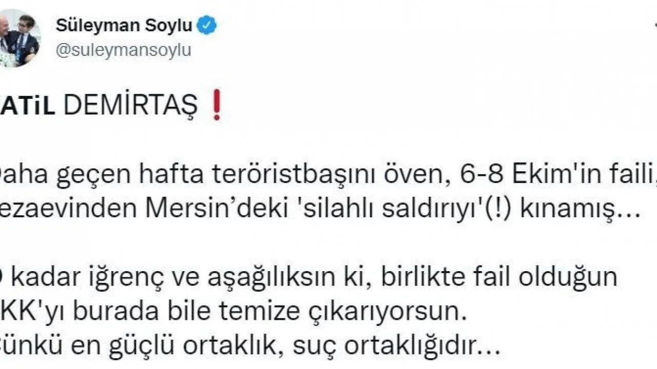 HDP eski Eş Genel Başkanı Selahattin Demirtaş, Mersin’de polisevine PKK’lı teröristlerce düzenlenen saldırıyı kınadığını duyurmuştu. Demirtaş’ın yaptığı paylaşımın ardından İçişleri Bakanı Süleyman Soylu bahsi geçen paylaşımı alıntılayarak, “Katil Demirtaş! Daha geçen hafta teröristbaşını öven, 6-8 Ekim’in faili, cezaevinden Mersin’deki ’silahlı saldırıyı’(!) kınamış. O kadar iğrenç ve aşağılıksın ki, birlikte fail olduğun PKK’yı burada bile temize çıkarıyorsun. Çünkü en güçlü ortaklık, suç ortaklığıdır” ifadelerini kullandı.