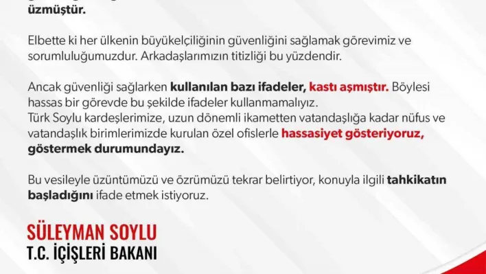 İçişleri Bakanı Süleyman Soylu, bugün sabah saatlerinde İstanbul’da protesto gösterisi için Çin Konsolosluğu önüne giden Uygur Türklerinin yolu kapatması üzerine grup ile bölgenin güvenliğini sağlamakla görevli polisler arasında yaşanan olay üzerine yazılı açıklama yaptı. Soylu, her ülkenin büyükelçiliğinin güvenliğini sağlamanın görevleri olduğunu hatırlatarak, “Ancak güvenliği sağlarken kullanılan bazı ifadeler kastı aşmıştır. Böylesi hassas bir görevde bu şekilde ifadeler kullanmamalıyız. Türk soylu kardeşlerimize uzun dönemli ikametten vatandaşlığa kadar nüfus ve vatandaşlık birimlerimizde kurulan özel ofislerle hassasiyet gösteriyoruz, göstermek durumundayız. Bu vesileyle üzüntümüzü ve özrümüzü tekrar belirtiyor, konuyla ilgili tahkikatın başladığını ifade etmek istiyoruz” ifadelerini kullandı.