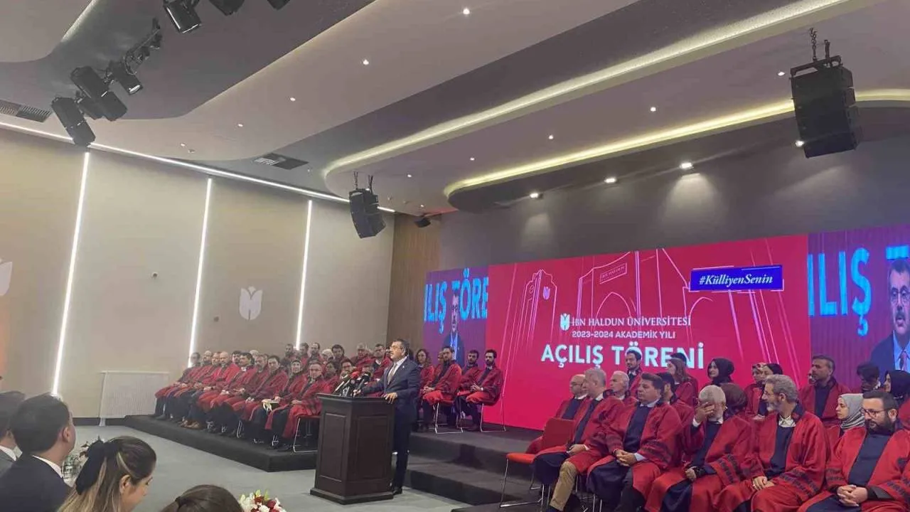 İbni Haldun Üniversitesi akademik yılı açılış programında ders veren Milli Eğitim Bakanı Prof. Dr. Yusuf Tekin, "Bizim eğitim sistemini analiz ederken eğer yüz yıl sonra çocuklarımız, torunlarımız bizi değişimi zamanında görememekle eleştirsinler istemiyorsak bugün devlet kavramında bu değişimi fark edip, eğitim sistemimizi ona göre revize etmemiz gerekiyor. Bunun altını çizmek isterim. Platon ideal devletle ilgili konuşurken altını çizdiği en önemli konulardan bir tanesi dinlemek. İnsanın kendi vücudunu yönetebilmesi lazım. Kulağını da yönetebilmesi lazım. Dinleyebilmesi lazım ki iyi bir yönetici olsun. Dolayısıyla dinlemek önemli bir haslet. İbni Haldun Üniversite’sinin kuruluş süresinde de müsteşardım. Kuruluşunda da bu konularla yakinen ilgilendim. O zaman ki hayaller ve idealler bugün böyle bir yapıyla karşılaşmak gerçekten insanı mutlu ediyor. Kuruluşunun üzerinden henüz çok kısa bir süre geçmiş olmasına rağmen biraz önceki süreçte Rektör Bey’in sabah ofisinde yaptığımız istişarelerde gördüğüm dinamik rekabetçi ve saygın bir üniversite olmasının yanı sıra çağımızın gerekliliklerine uygun bir kurum kültürü oluşturmuş olmasını takdirle karşılıyorum" şeklinde konuştu.