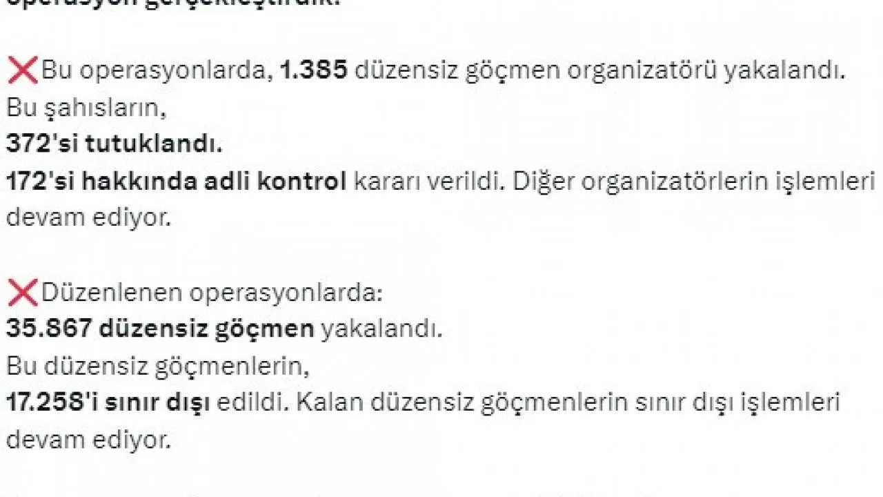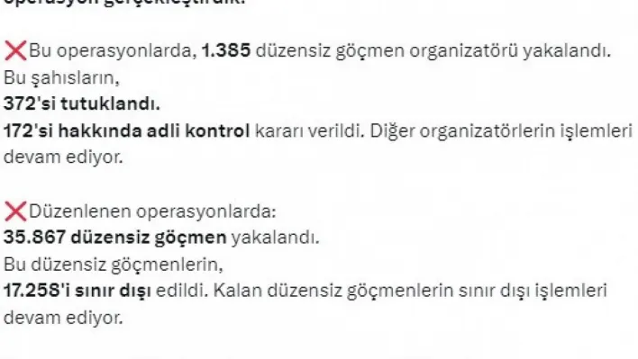 "Düzenlenen operasyonlarda 35 bin 867 düzensiz göçmen yakalandı. Bu düzensiz göçmenlerin 17 bin 258’i sınır dışı edildi. Kalan düzensiz göçmenlerin sınır dışı işlemleri devam ediyor. Operasyonları düzenleyen kahramanlarımızı tebrik ediyorum. Düzensiz göçle mücadelemizi aralıksız sürdüreceğiz. Göçmen kaçakçılığı organizatörlerinin nefeslerini keseceğiz."