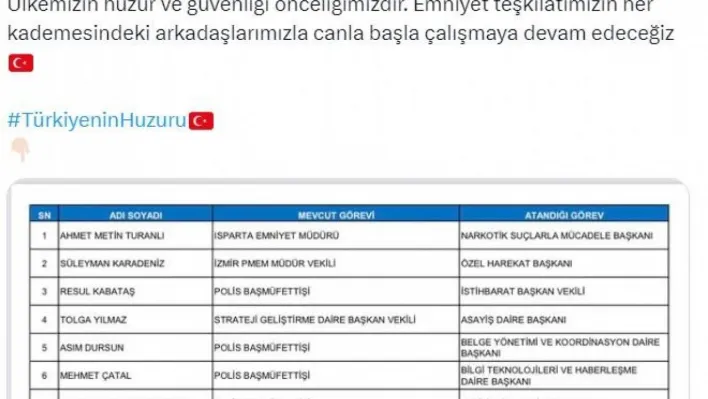 Yapılan görev değişiklikleri ile Isparta Emniyet Müdürü Ahmet Metin Turanlı Narkotik Suçlarla Mücadele Başkanlığına, İzmir PMEM Müdür Vekili Süleyman Karadeniz Özel Harekat Başkanlığına, Polis Başmüfettişi Resul Kabataş İstihbarat Başkan Vekilliğine, Strateji Geliştirme Daire Başkan Vekili Tolga Yılmaz Asayiş Daire Başkanlığına, Polis Başmüfettişi Asım Dursun Belge Yönetimi ve Koordinasyon Daire Başkanlığına, Polis Başmüfettişi Mehmet Çatal Bilgi Teknolojileri ve Haberleşme Dair Başkanlığına, Polis Başmüfettişi Mustafa Serkan Sabanca Dış İlişkiler Daire Başkanlığına, Kırıkkale Emniyet Müdürü Fahri Bulut Göçmen Kaçakçılığıyla Mücadele ve Hudut Kapıları Daire Başkanlığına, Özel Güvenlik Denetleme Başkan Yardımcısı Maksut Yüksek Güvenlik Daire Başkanlığına, Polis Başmüfettişi Tamer Taş Koruma Daire Başkanlığına, Polis Başmüfettişi Tuncay Ankara Kriminal Daire Başkanlığına, Polis Başmüfettişi Asım Bulat Sosyal Hizmetler ve Sağlık Daire Başkanlığına, Polis Başmüfettişi Seylan Demir Strateji Geliştirme Daire Başkanlığına, Özel Güvenlik Denetleme Başkan Yardımcısı Ergün Dağıstanlı ise Terörle Mücadele Daire Başkanlığına atandı.