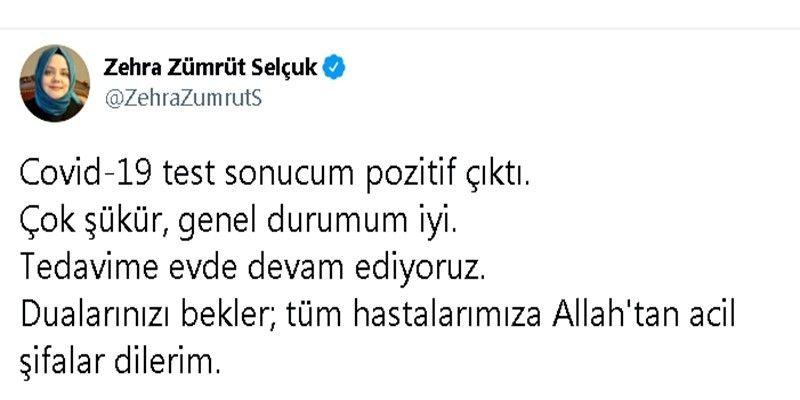 Aile, Çalışma ve Sosyal Hizmetler Bakanı Zehra Zümrüt Selçuk, Covid-19 testinin pozitif çıktığını duyurdu.