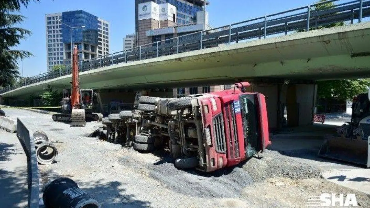 Bakırköy'de yol çöktü: Hafriyat kamyonu devrildi