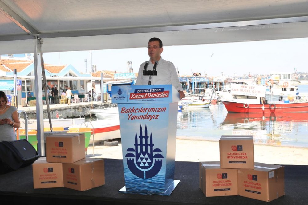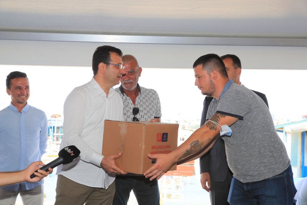İmamoğlu, konuşmaların ardında platforma çağrılan Neslihan Uslular, Hüseyin Köksalan ve Şahin Üstün isimli balıkçılara yardım kolilerini telsim etti. İBB Muhtarlıklar ve Gıda Daire Başkanlığı bünyesindeki Tarım ve Su Ürünleri Müdürlüğü, 34 plakalı, 12 metre altı, balık avlama ruhsatı bulunan toplam 1.685 teknenin sahiplerinden 25 Mart 2021’de talep toplamaya başladı. 1 ay süren talep toplama sürecinin ardından, toplam 1.200 küçük ölçekli balıkçı, İBB desteğinden yararlanmaya hak kazandı. Destek kapsamında, balıkçılara dağıtılacak malzemeler şunlar olacak: