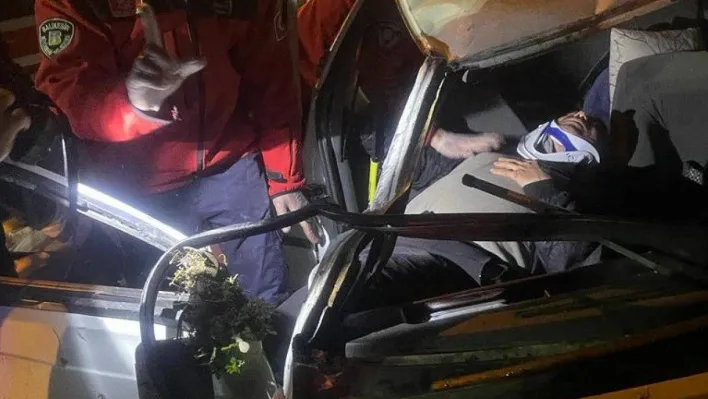 Balıkesir'in Burhaniye ilçesinde tırla çarpışan otomobilin içinde sıkışan sürücüyü itfaiye kurtardı.