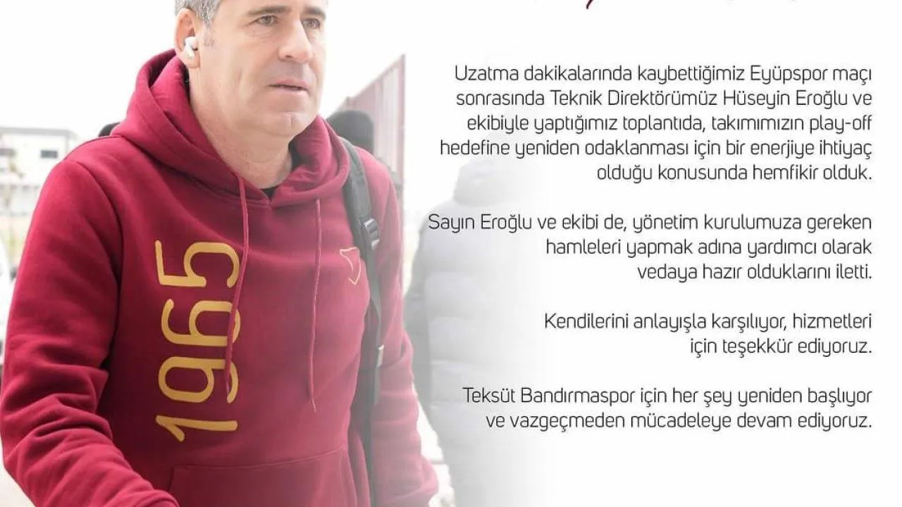 Trendyol 1.Lig takımlarından Bandırmaspor evinde Eyüpspor’a 3-2 mağlup oldu. Mücadele sonrası Bandırmaspor Teknik Direktörü Hüseyin Eroğlu dönemi sona erdi. Konuyla ilgili kulübün sosyal medya hesabından yapılan açıklamada, "Uzatma dakikalarında kaybettiğimiz Eyüpspor maçı sonrasında Teknik Direktörümüz Hüseyin Eroğlu ve ekibiyle yaptığımız toplantıda, takımımızın play-off hedefine yeniden odaklanması için bir enerjiye ihtiyaç olduğu konusunda hemfikir olduk. Sayın Eroğlu ve ekibi de yönetim kurulumuza gereken hamleleri yapmak adına yardımcı olarak vedaya hazır olduklarını iletti. Kendilerini anlayışla karşılıyor, hizmetleri için teşekkür ediyoruz. 1965 Bandırmaspor için her şey yeniden başlıyor ve vazgeçmeden mücadeleye devam ediyoruz" denildi.