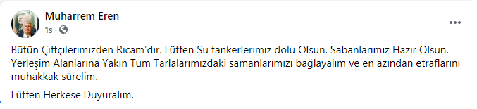 Silivri Köy ve Mahalle Muhtarları Derneği Başkanı, Fener mahalle muhtarı Muharrem Eren, bölgemizdeki çiftçilere seslenerek 'Lütfen Su tankerlerimiz dolu Olsun' uyarısında bulundu.