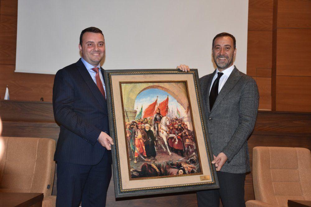 AK Parti İlçe Başkanı Mutlu Bozoğlu, ziyaret anısına Başkan Yılmaz’a Fatih Sultan Mehmet’in İstanbul fethini anlatan tablo hediye etti.