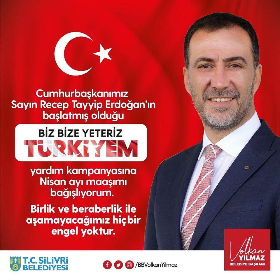Silivri Belediye Başkanı Volkan Yılmaz, maaşını 'Biz Bize Yeteriz Türkiyem' kampanyasına bağışladı.