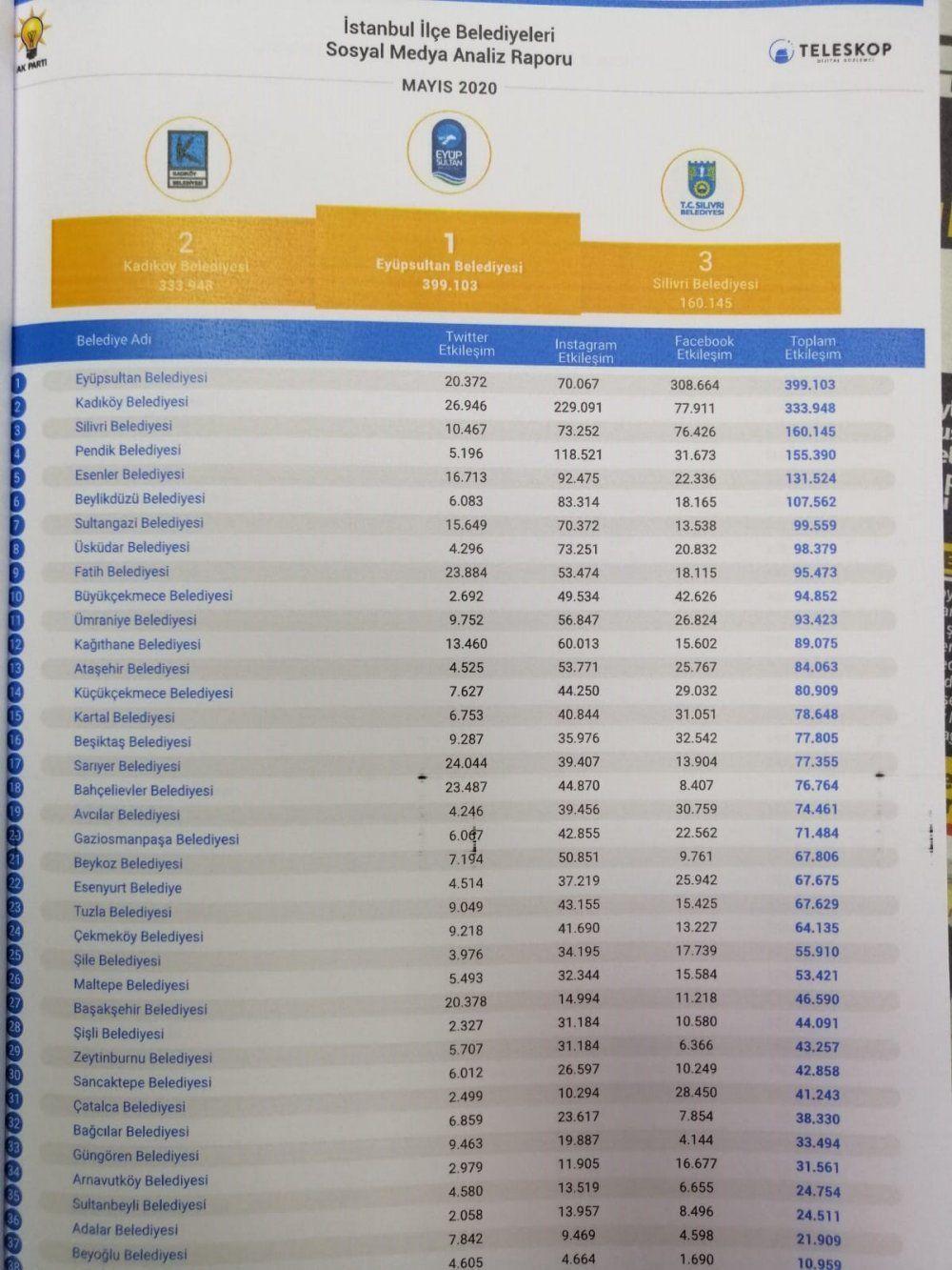AK Parti tarafından Teleskop adlı araştırma şirketine her ay düzenli olarak yaptırılan "İstanbul İlçe Belediye Başkanları Sosyal Medya Analiz Raporu"na göre Silivri Belediye Başkanı Volkan Yılmaz, Mayıs ayında da ikinciliğini korudu.