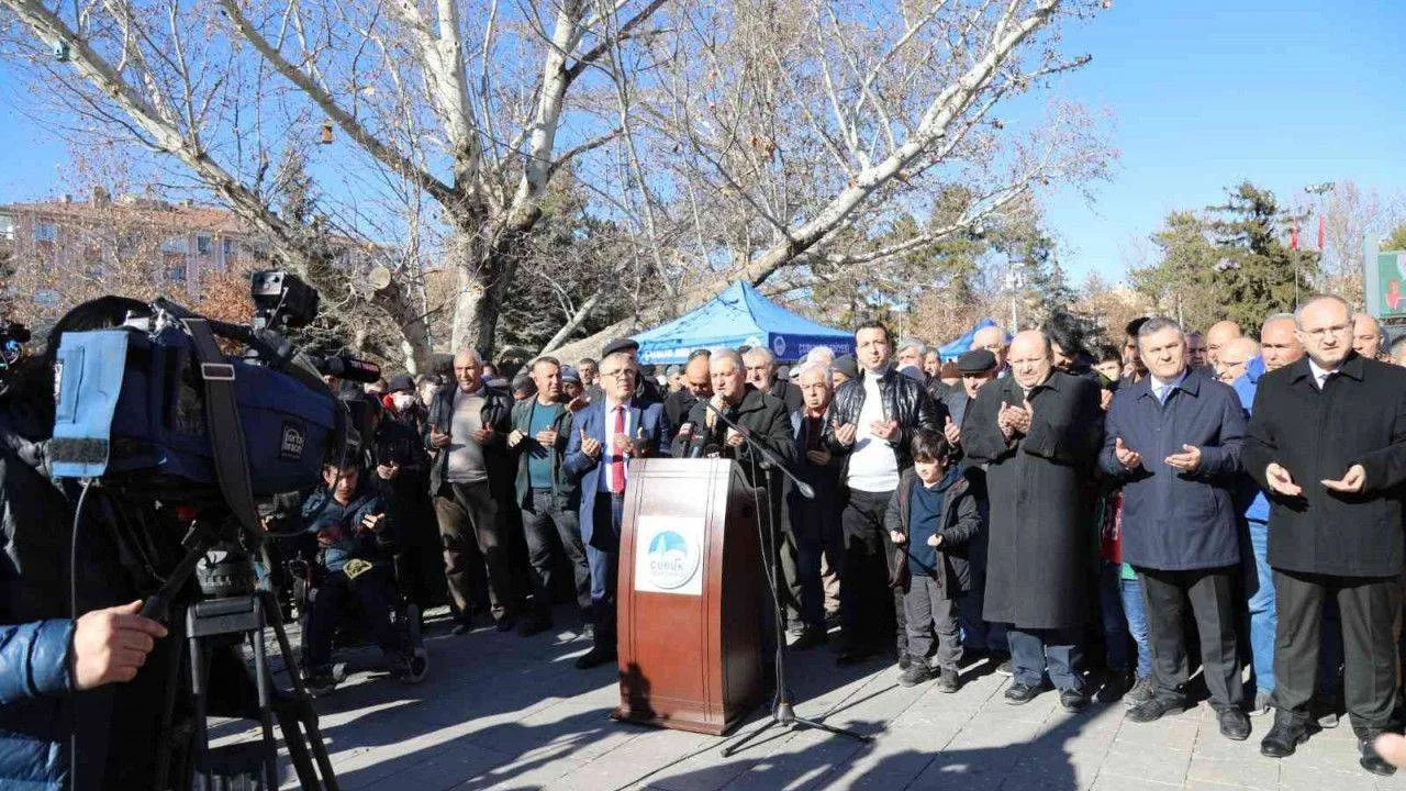 Türkiye’de ilk defa kar duasına çıkıldığını aktaran Çubuk Dernekler Federasyonu Başkanı Fuat Duyan, “Gördüğünüz gibi yaz mevsimi yaşıyoruz. Belki Türkiye’de ilk defa kar duası yapacağız. Teşebbüste bulunmak için yola çıktık. Çubuk’taki tüm STK’lar, muhtaralar, belediye ve kaymakamlığın desteği ile 4 gün içerisinde 5 küçükbaş, 3 tane büyükbaş kurban kestik. Burası konuşma yeri değil yağmur duası için buradayız” ifadelerine yer verdi.