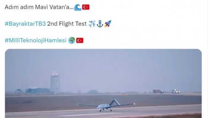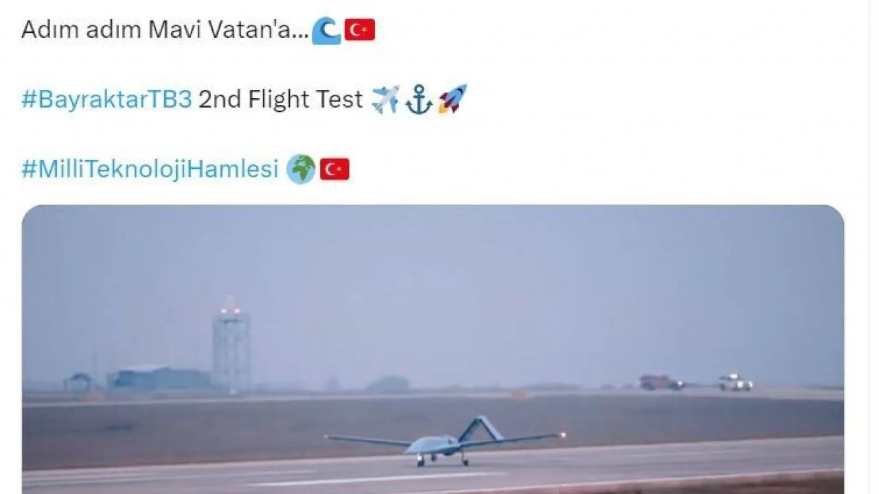 Baykar tarafından milli ve özgün olarak geliştirilen Bayraktar TB3 Silahlı İnsansız Hava Aracı (SİHA), ikinci uçuş testini başarıyla tamamladı. Baykar Yönetim Kurulu Başkanı ve Teknoloji Lideri Selçuk Bayraktar, BayraktarTB3, 4 saat süren 2. uçuş testini de başarıyla tamamladı. Adım adım Mavi Vatan'a' dedi.