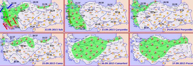 Bayramın 1. günü Marmara, Kıyı Ege ile Batı Karadeniz kıyılarında sağanak yağışlar görülecek, diğer bölgelerimizin parçalı ve az bulutlu geçeceğinin tahmin ediliyor. Hava sıcaklığı 25-28 derece arası olacak.