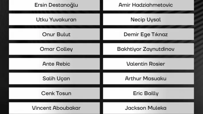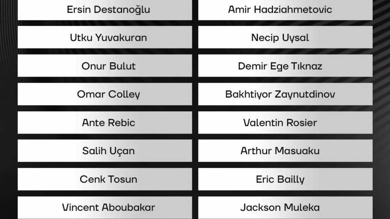 "Mert Günok, Ersin Destanoğlu, Utku Yuvakuran, Onur Bulut, Omar Colley, Ante Rebic, Salih Uçan, Cenk Tosun, Vincent Aboubakar, Milot Rashica, Daniel Amartey, Oxlade-Chamberlain, Rachid Ghezzal, Amir Hadziahmetovic, Necip Uysal, Demir Ege Tıknaz, Bahtiyar Zaynutdinov, Valentin Rosier, Arthur Masuaku, Eric Bailly, Jackson Muleka, Jean Onana, Gedson Fernandes, Semih Kılıçsoy."