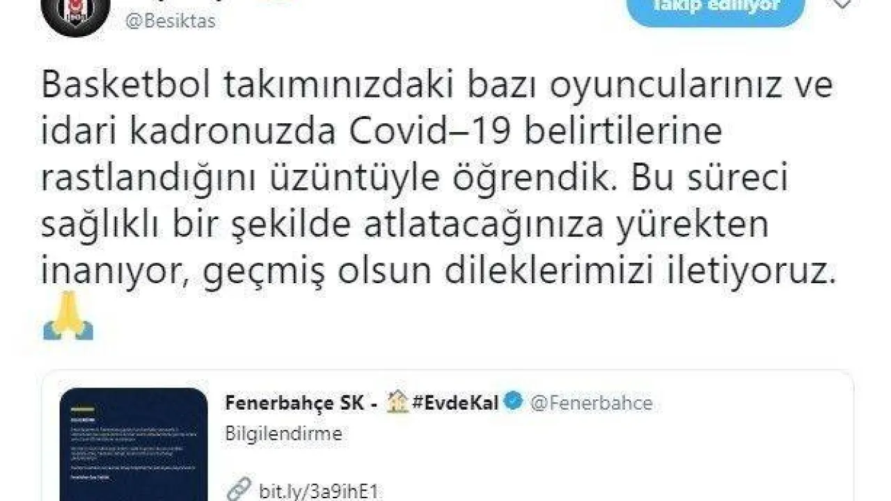 BEŞİKTAŞ, FENERBAHÇE ERKEK BASKETBOL TAKIMI'NIN BAZI OYUNCULARI VE İDARİ PERSONELİNDE KORONA VİRÜS BELİRTİLERİ GÖRÜLMESİ NEDENİYLE SARI-LACİVERTLİLER İÇİN GEÇMİŞ OLSUN MESAJI PAYLAŞTI.