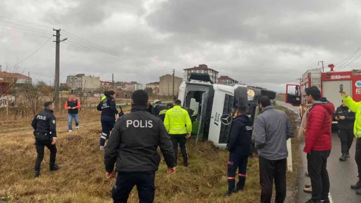 Tekirdağ Çorlu'da kaygan zeminde yoldan çıkan beton mikseri şarampole devrildi. Araçta mahsur kalan yaralı sürücüyü itfaiye ekipleri kurtardı.