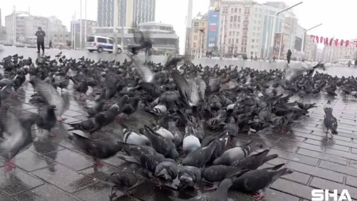 İstanbul'da yağan karla beyaza bürünen Taksim Meydanı kuşlara ve az sayıdaki turistlere kaldı. Kısıtlamadan muaf olan turistler meydanda kuşları besleyerek, bol bol hatıra fotoğrafı çekildi.