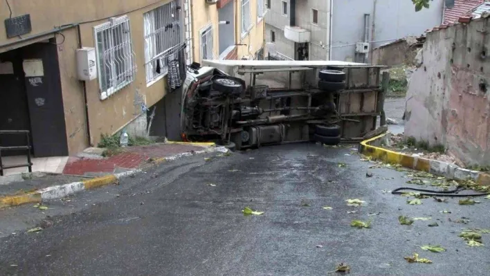 Beyoğlu'nda yokuş aşağı giderken yağmurun da etkisiyle kontrolden çıkan kamyon, kaldırıma çarparak devrildi. Kamyon 5 katlı bir binaya çarparak dururken, o sırada giriş katındaki evinde olan 7 aylık hamile kadın büyük bir panik yaşadı. Kazada kamyon şoförü hafif şekilde yaralanırken, hamile kadının sağlık durumunun iyi olduğu öğrenildi.