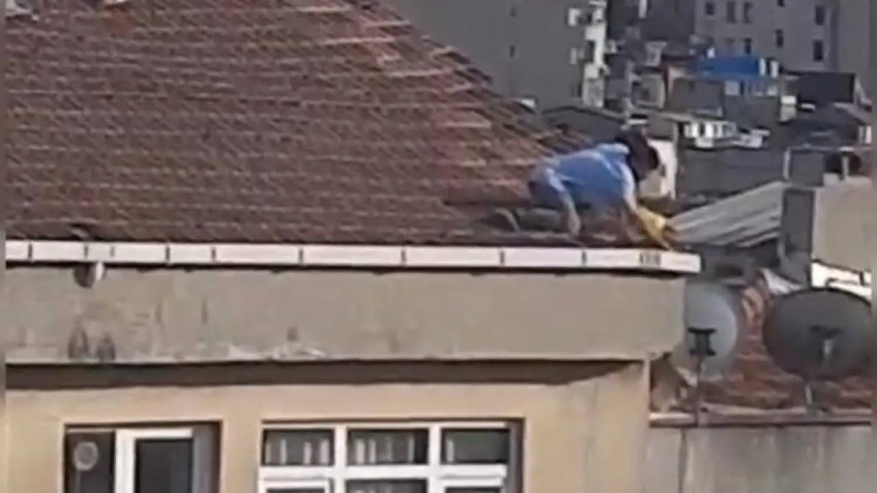 Beyoğlu'nda bir binanın çatısında bulunan kişinin güvenlik önlemi almadan yaptığı çatı tamiri, yürekleri ağza getirdi. Tamir yapan kişinin bazı anlarda çatının ucuna gelerek soğukkanlılıkla işine devam etmesi şaşkınlığa yol açtı. O tehlikeli anlar, cep telefonu kamerası tarafından kaydedildi.