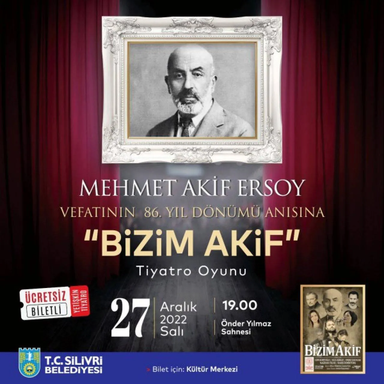 Silivri Belediyesi, İstiklal Şairi Mehmet Akif Ersoy'un vefatının 86. yıl dönümü anısına 'Bizim Akif' isimli bir tiyatro oyunu sahneliyor. 27 Aralık 2022 Salı günü saat 19.00'da Önder Yılmaz Sahnesinde gerçekleştirilecek tiyatro oyununa Silivrililer ücretsiz olarak katılım sağlayabilecek.