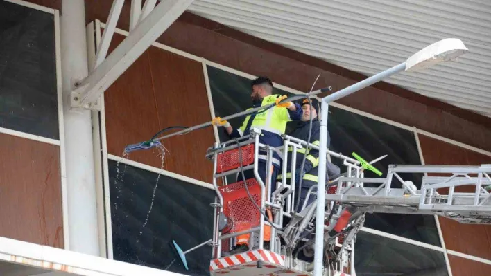 Bozüyük Şehirler Arası Otobüs Terminali'nin dış cephe camları Ramazan Bayramı öncesinde tazyikli su ile yıkanarak temizlendi.