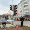 Bozüyük'te ilçe genelinde bulunan trafik ışıkları fırçalarla temizleniyor.