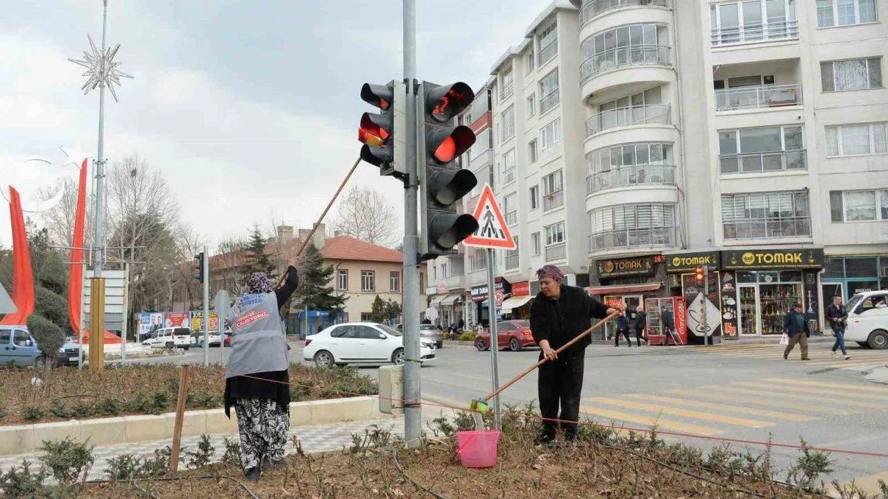 Bozüyük’te ilçe genelinde bulunan trafik ışıkları fırçalarla temizleniyor.