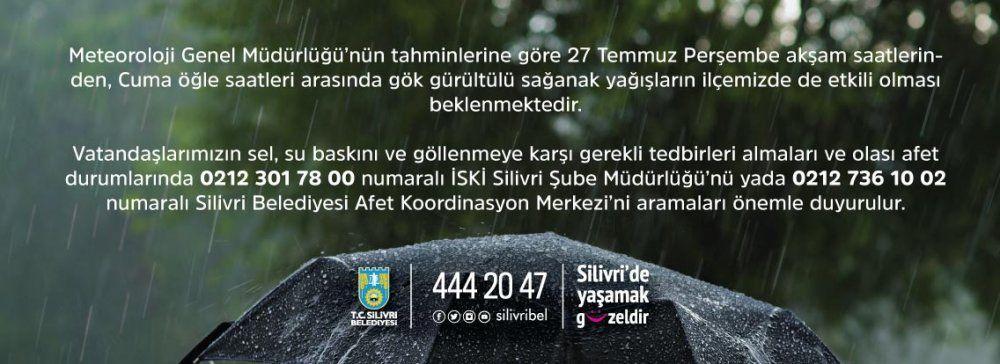 Vatandaşlarımızın sel, su baskını ve göllenmeye karşı gerekli tedbirleri almaları ve olası afet durumlarında 0212 301 78 00 numaralı İSKİ Silivri Şube Müdürlüğü'nü ya da 0212 736 10 02 numaralı Silivri Belediyesi Afet Koordinasyon Merkezi'ni aramaları önemli duyurulur."