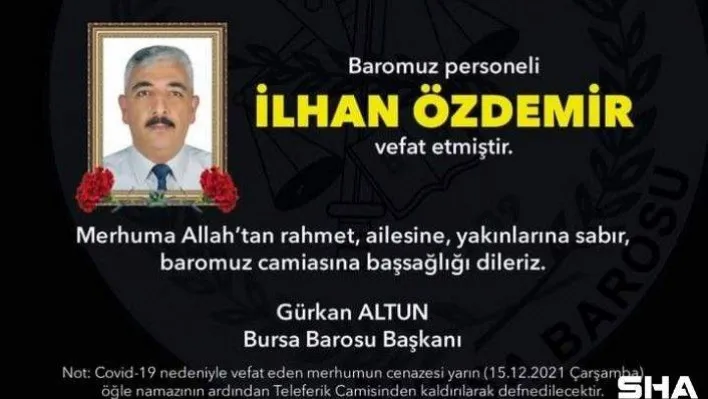 Bursa Barosunda uzun yıllardır görev yapan 54 yaşındaki İlhan Özdemir 14 gün önce yakalandığı koronavirüs sebebiyle öldü. Özdemir’in ölümü Bursa Barosunda şoka sebep olurken sevenlerini yasa boğdu. Özdemir’in cenazesi bugün öğleyin Teleferik Camii’nde kılınacak cenaze namazının ardından toprağa verilecek.