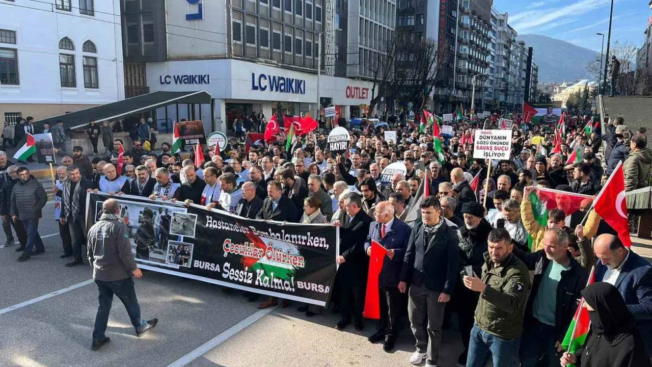 Bursa'da '10 Aralık Dünya İnsan Hakları Günü' nedeniyle binlerce kişi Filistin'e yapılan zulmü protesto etti. Vatandaşlar sloganlarla yürüyüş yaparken birçok sivil toplum kuruluşu ve siyasetçi de yürüyüşe katıldı.