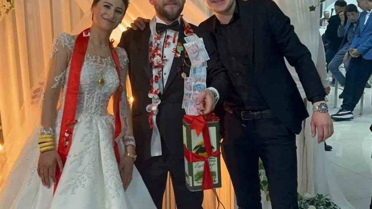 Bursa’nın İznik ilçesinde bir çiftin düğün merasiminde damada 5 litrelik teneke zeytinyağı takı olarak takıldı. Arkadaşların bu şakası damat ve gelini güldürdü.