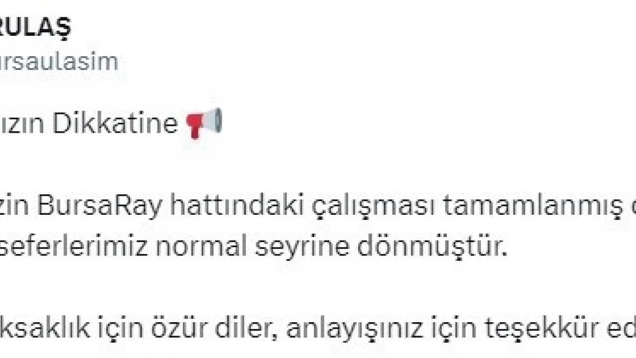 BURULAŞ’ın sosyal medya hesaplarından yapılan açıklamada, “Ekiplerimizin BursaRay hattındaki çalışması tamamlanmış olup, BursaRay seferlerimiz normal seyrine dönmüştür. Yaşanan aksaklık için özür diler, anlayışınız için teşekkür ederiz” denildi.