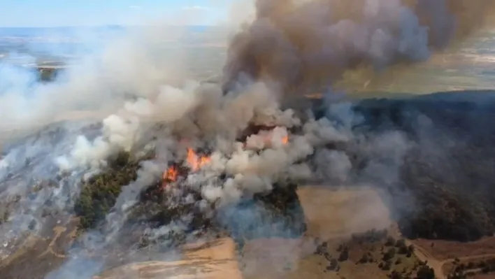 Bursa'nın Yenişehir ilçesi Fethiye Mahallesi'ndeki ormanlık alanda başlayan yangın, havadan görüntülendi. Rüzgarın da etkisiyle alevler büyümeye devam ediyor.