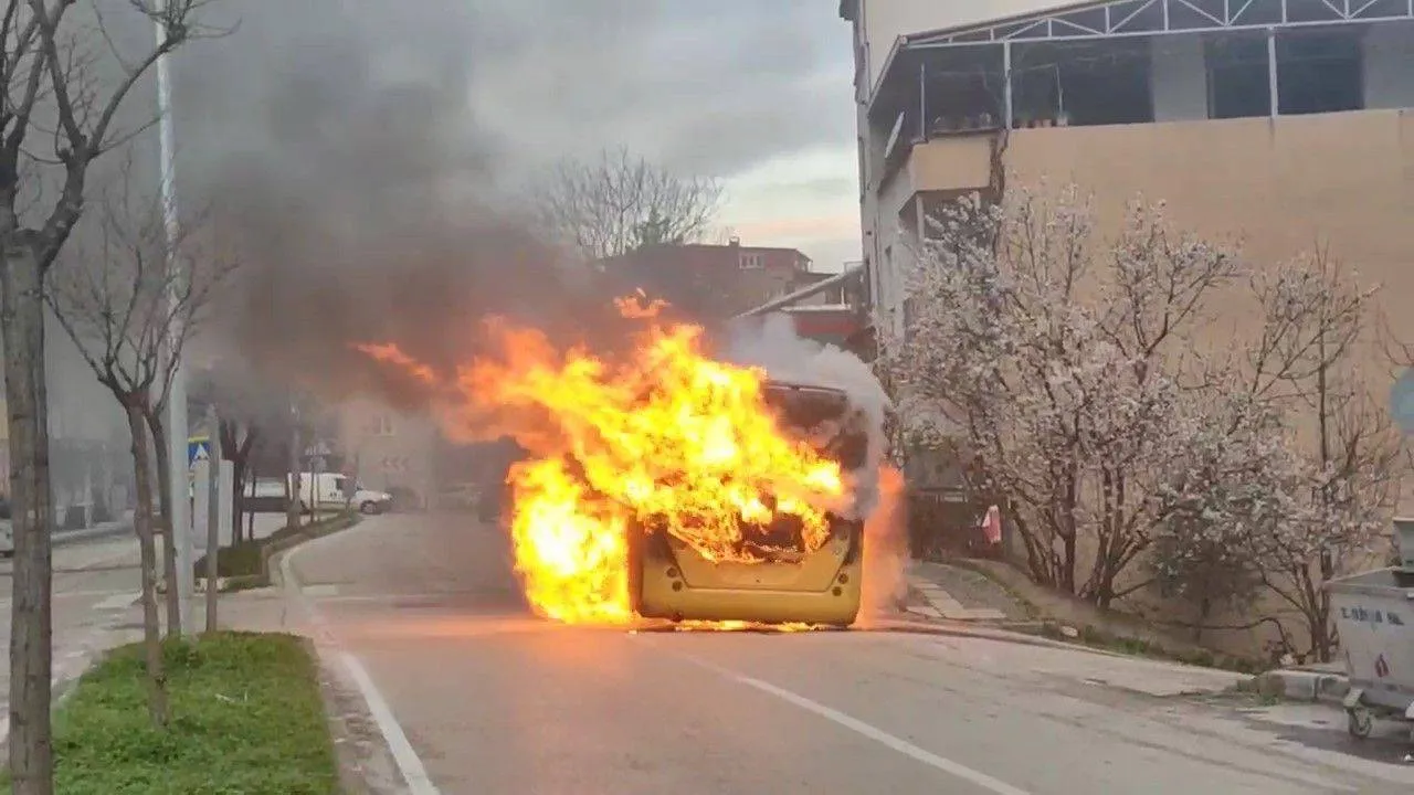 Bursa'da seyir halindeki şehir içi halk otobüsü alev alev yandı. İtfaiye ekiplerince söndürülen yangında can kaybı yaşanmazken, otobüs kullanılamaz hale geldi.
