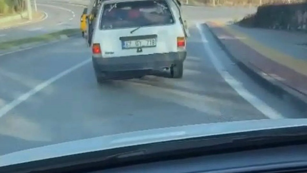 Bursa'da bir Kartal sürücüsü, kesilmiş araç tavanını kendi aracının üstüne koyarak götürdü. O anlar trafikteki başka bir sürücünün cep telefon kamerasına yansıdı.