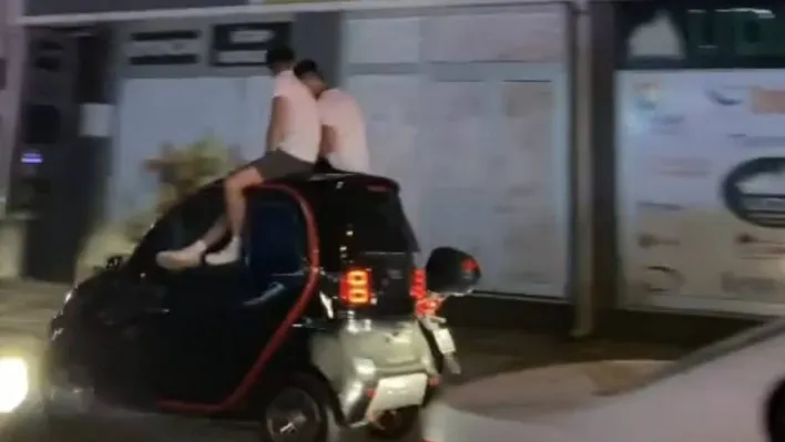 Bursa'nın İnegöl ilçesinde gençlerin elektrikli araç üzerinde seyretmeleri amatör kameraya yansıdı.