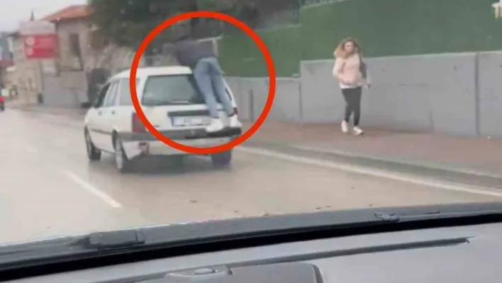 Bursa'da bir kişi, otomobilin bagajına basıp tavanına tutunarak ölüme meydan okudu. O anlar anbean amatör kameraya yansıdı.