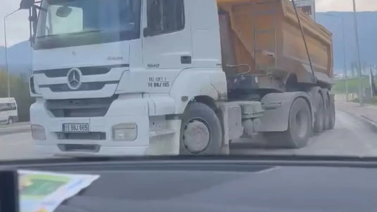 Bursa'da ters şeritten girerek yola çıkmak isteyen kamyon, trafiği tehlikeye düşürdü. 'Pes' dedirten görüntüler, vatandaş tarafından cep telefonu ile kayda alındı.