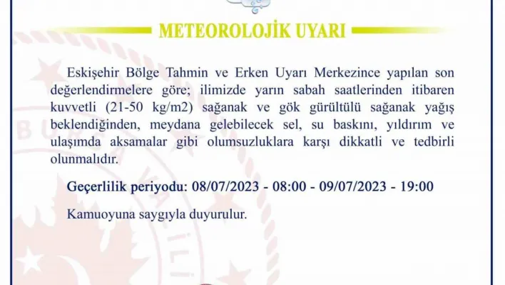 "Eskişehir Bölge Tahmin ve Erken Uyarı Merkezince yapılan son değerlendirmelere göre, ilimizde yarın sabah saatlerinden itibaren kuvvetli 21 ile 50 kilogram metrekare sağanak ve gök gürültülü sağanak yağış beklendiğinden, meydana gelebilecek sel, su baskını, yıldırım ve ulaşımda aksamalar gibi olumsuzluklara karşı dikkatli ve tedbirli olunmalıdır."