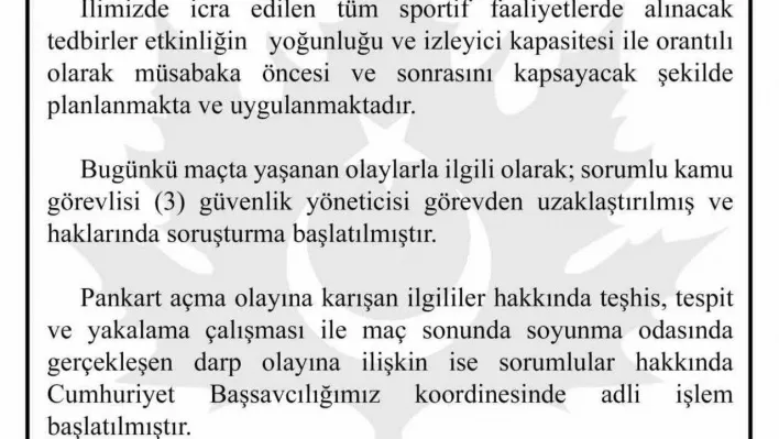 Bursa Valiliği, TFF 2. Lig mücadelesinde Bursaspor’un galibiyeti ile sonuçlanan Amedspor müsabakasında yaşanan olaylar hakkında açıklama yaptı. Valilik açıklamasında, “İlimizde icra edilen tüm sportif faaliyetlerde alınacak tedbirler etkinliğin yoğunluğu ve izleyici kapasitesi ile orantılı olarak müsabaka öncesi ve sonrasını kapsayacak şekilde planlanmakta ve uygulanmaktadır. Bugünkü maçta yaşanan olaylar ile ilgili olarak; sorumlu kamu görevlisi 3 güvenlik yöneticisi görevden uzaklaştırılmış ve haklarında soruşturma başlatılmıştır. Pankart açma olayına karışan ilgililer hakkında teşhis, tespit ve yakalama çalışması ile maç sonunda soyunma odasında gerçekleşen darp olayına ilişkin ise sorumlular hakkında Cumhuriyet Başsavcılığımız koordinesinde adli işlem başlatılmıştır. Bu kapsamda şu ana kadar 7 kişi gözaltına alınmıştır. Kamuoyuna saygıyla duyurulur.” denildi.