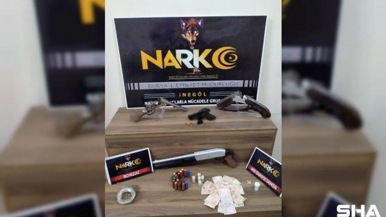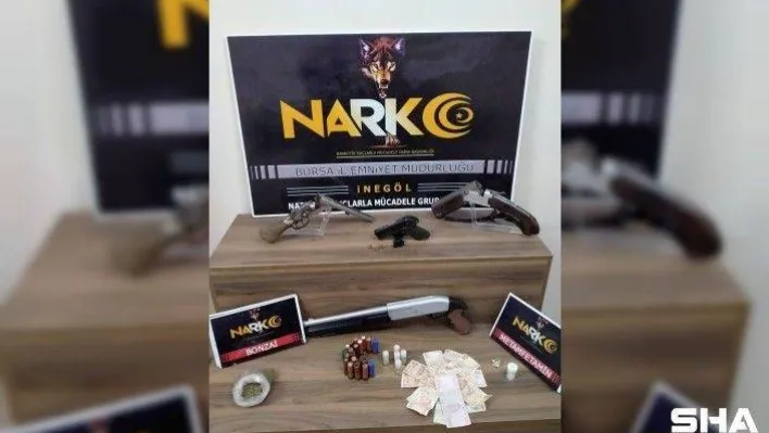 İnegöl Emniyet Müdürlüğü ekipleri şüpheliler Doğan H. (27) ve Gencer H. (25) isimli şahıslara ait Yenice Mahallesi Orhaniye Sokak’taki adrese operasyon düzenledi. Evde yapılan aramada 3 adet tüfek, 25 adet fişek, 1 adet tabana ve tabancaya ait mermiler, 20 gram metamfetamin ve 107 gram bonzai ile uyuşturucu madde ticaretinden kazanıldığı belirlenen 680 TL para ele geçirildi.