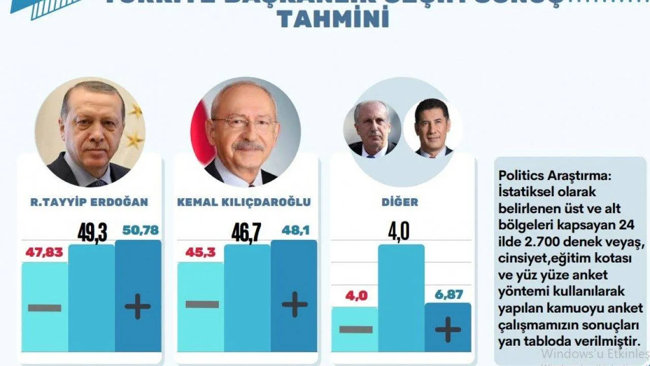 Politics Araştırma şirketinin 24 ilde 2 bin 700 kişi katılımıyla yaptığı çalışmada TUİK verileri baz alınarak 12 üst bölgede ve 12 alt bölgede yüz yüze anket tekniği kullanıldı. Çalışmaların 14 mayıs seçimlerinde ilk turda bitmeyeceğini belirtirken, yüzde 50’nin üzerinde alabilecek adayın Cumhurbaşkanı Recep Tayyip Erdoğan olduğu aktarıldı.