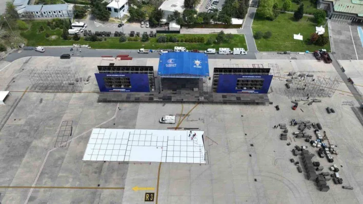 Cumhurbaşkanı Recep Tayyip Erdoğan’ın katılımıyla 7 Mayıs Pazar günü İstanbul’da düzenlenecek ’’Yüzyılın Mitingi" için Atatürk Havalimanı’nda son hazırlıklar havadan görüntülendi. Dev sahne kurulumu ve çadırların kurulumu için işçilerin çalışması dron kamerasına yansıdı.