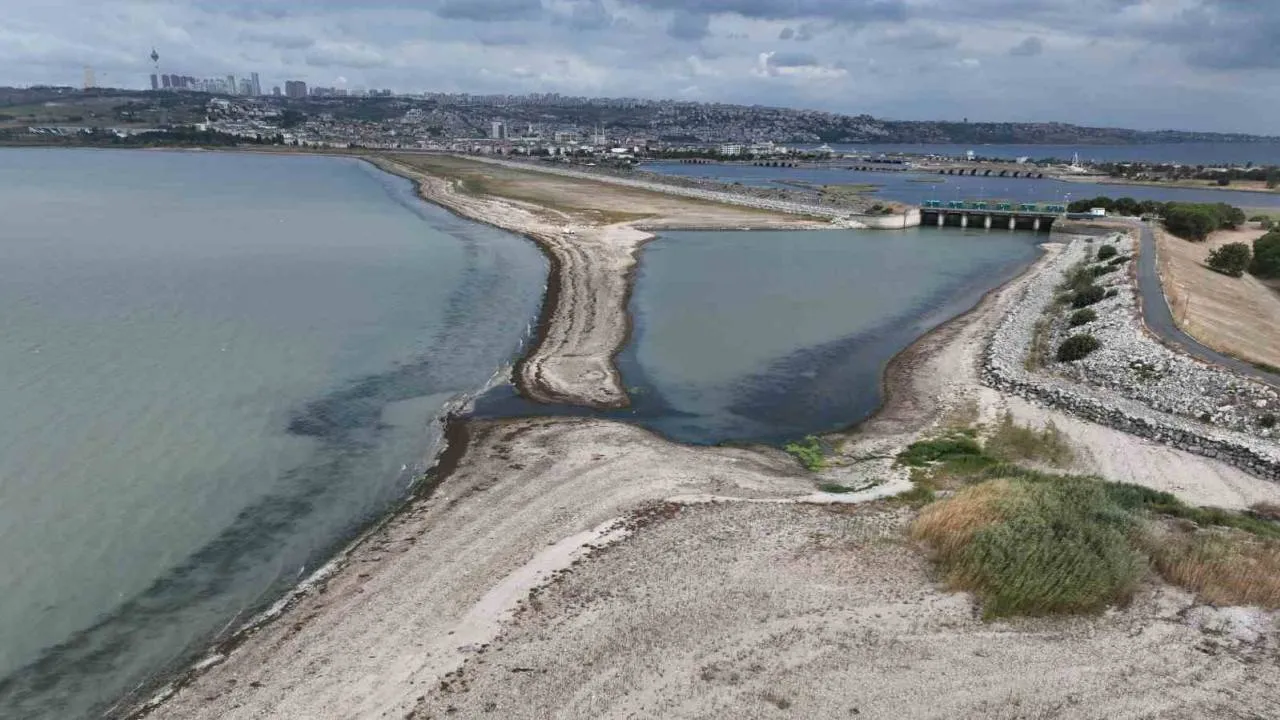 İstanbul’da hava sıcaklıklarının mevsim normallerinin üzerine çıkmasıyla kentin su kaynaklarından Büyükçekmece Gölü’ndeki çekilme devam ediyor. Havadan dron ile çekilen görüntülerde gölde kara parçalarının ortaya çıktığı görüldü.