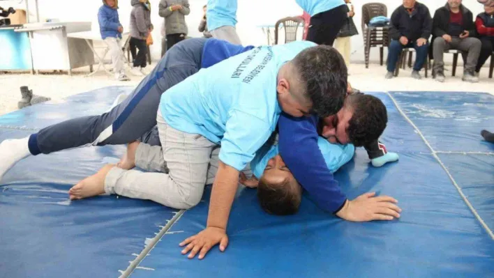 Çadırkentte başpehlivanlar, depremzede çocuklara tuş oldu
