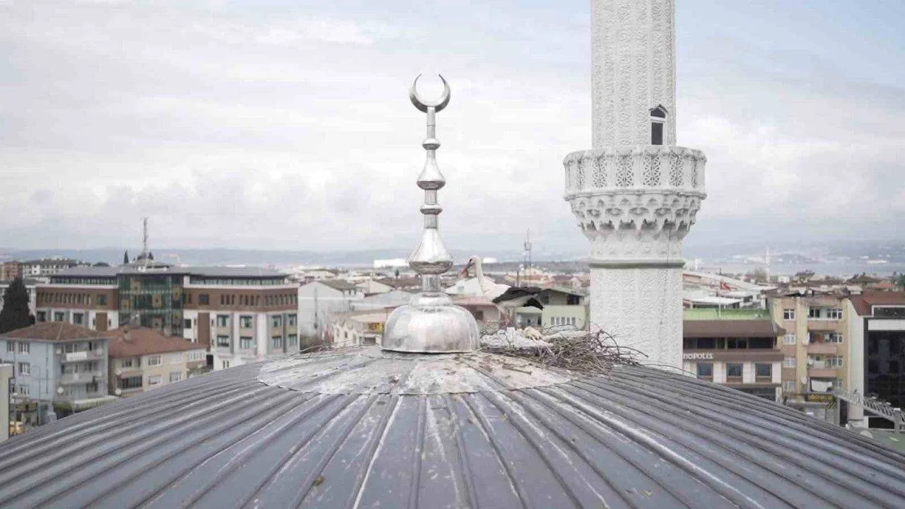 Cami kubbesinde kuluçkaya yatan leyleğe özel yuva