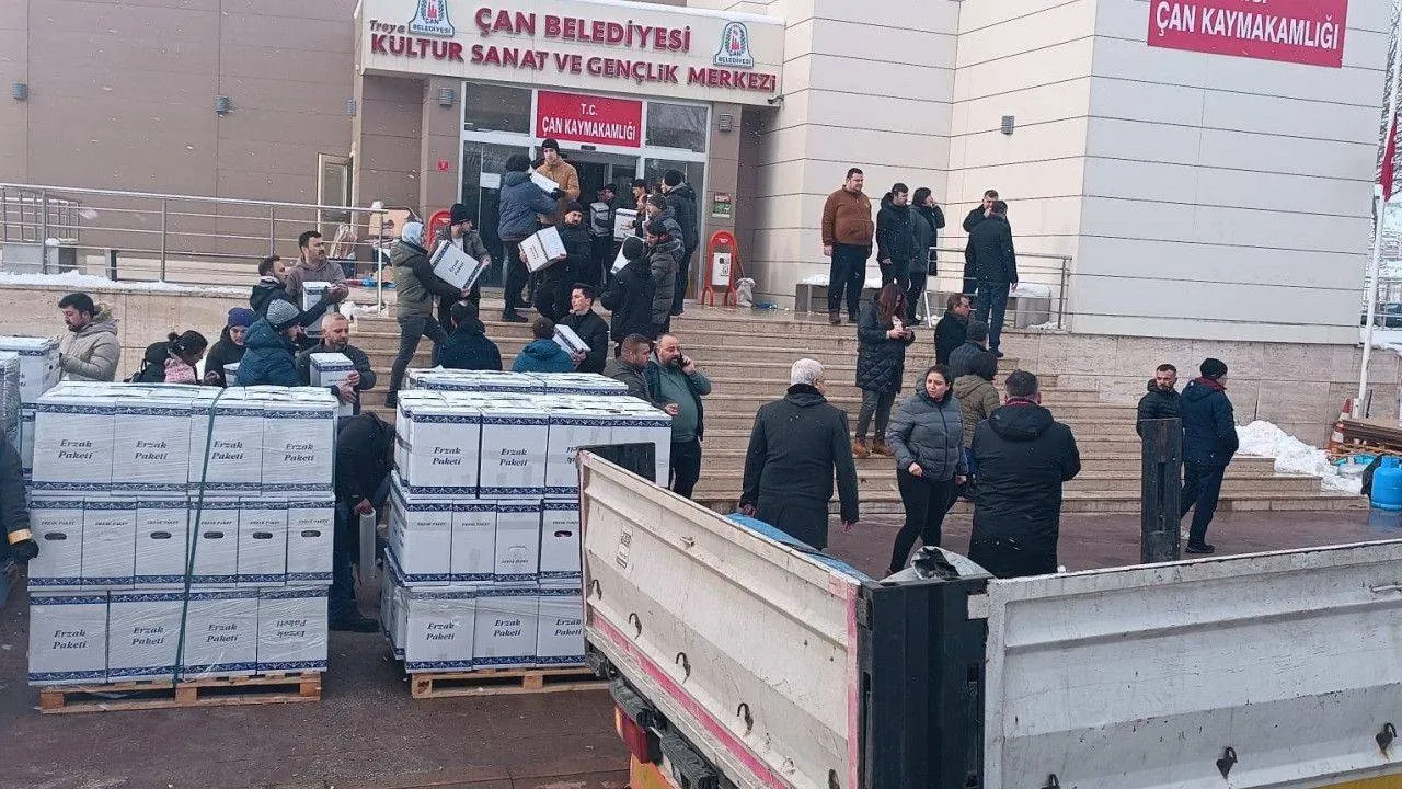 Çan Kaymakamı Mustafa Gürdal, Belediye Başkanvekili Harun Arslan ve Sivil toplum kuruluşları başkanlarıyla birlikte uğurlanan TIR’lar yola çıktı. Kahramanmaraş’ta meydana gelen ve 10 ili etkileyen depremin ardından seferber olan Çan halkı, Çan kaymakamlığının ve Belediye Başkanlığının koordinesinde Çan Belediyesi Kültür Sanat ve Gençlik merkezinde toplanan gıda malzemelerini koli olarak paketliyorlar. Çan Belediye Başkanvekili Harun Arslan, “Çan Kaymakamlığı ve Belediye Başkanlığımızın depremzedelere destek olmak için başlattığı yardım kampanyasına Çan halkımız yoğun bir katılım gösterdi. Toplanan battaniye ,tüp, giyecek soba ve gıda malzemelerinden oluşan 2 TIR’ımız bölgeye sevk edildi. Yardımlar devam ediyor. Personelimiz ve gönüllü vatandaşlarımız gelen yardımları ayırarak paketledikten sonra tırlarımıza yükleme yapılıyor. Çan’dan uzanan kardeşlik eline destek veren tüm Çan halkımıza teşekkür ediyorum. Gün birlik olma günüdür. Yüreğimiz ve desteğimiz bölgedeki vatandaşlarımız içindir” dedi.