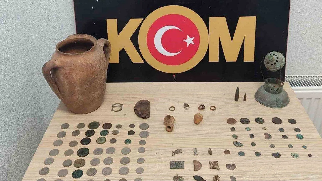 Çanakkale İl Emniyet Müdürlüğü Kaçakçılık ve Organize Suçlarla Mücadele (KOM) ekiplerince tarihi eser kaçakçılığıyla mücadele devam ediyor. Ekipler tarafından yapılan çalışmalar neticesinde N.D.’nin evine operasyon düzenlendi. Operasyonda tarihi eser olduğu değerlendirilen 25 sikke, Osmanlı dönemine ait olduğu değerlendirilen 77 sikke, 18 metal obje, kemer tokası, siyah taşlı olmak üzere toplam 4 yüzük, Çanakkale Savaşları’ndan kalma olduğu değerlendirilen at nalı parçası, 4 santim uzunluğunda 3 santim genişliğinde üzerinde insan silueti bulunan heykel başı ve anfora ele geçirildi. Gözaltına alınan şüpheli N.D. hakkında adli işlem yapılırken, emniyetteki işlemlerinin ardından savcılık talimatıyla serbest bırakıldı.